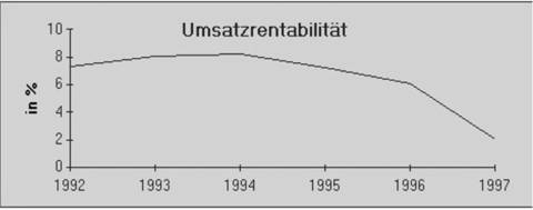 Wenn wir vom Verdrängungsmarkt sprechen, meinen wir damit, daß sich die Anbieter, oft beschönigend als Mitbewerber bezeichnet, durch eine gnadenlose Konkurrenz gegenseitig versuchen das Wasser abzugraben. Diese Versuche beschränken sich zur Zeit ausschließlich darauf, mit Hilfe der Preisunterbietung und der Mengenanpassung den Konkurrenten zu schlagen. Im Punkt 3.3 Situation in der Branche wird das noch mal bewiesen. Jedes Unternehmen, das da mitspielt, hat noch einen langen und wahrscheinlich hoffnungslosen Kampf vor sich. Viele Polypolisten, besonders wenn sie eine Größe und Marktstellung die etwa der NFB GmbH entspricht erreicht haben, glauben diesen Kampf zu bestehen und sehen auch keine andere Möglichkeit sich durchzusetzen. Das strategische Konzept dieser Unternehmen ist darauf gerichtet, die "Saure Gurkenzeit" irgendwie zu überstehen und auf ein Ende der Baukrise zu hoffen. In so fern ist dagegen auch nichts zu sagen, denn dann bestünde die Möglichkeit sich zu einem Oligopolisten in der Region zu entwickeln weil viele Andere inzwischen aufgeben mußten. Diese Strategie hat jedoch den Haken. Kein Unternehmen kann mit Bestimmtheit von sich behaupten, im Kampf zu überleben. Das folgende Diagramm über die Umsatzrentabilität der NFB GmbH zeigt, daß der polypolistische Mengenausgleich ab 1995 nicht mehr ausreichend ist und daß durch den Knick zu 1997 bei anhaltender Tendenz 1999 rote Zahlen zu erwarten sind.